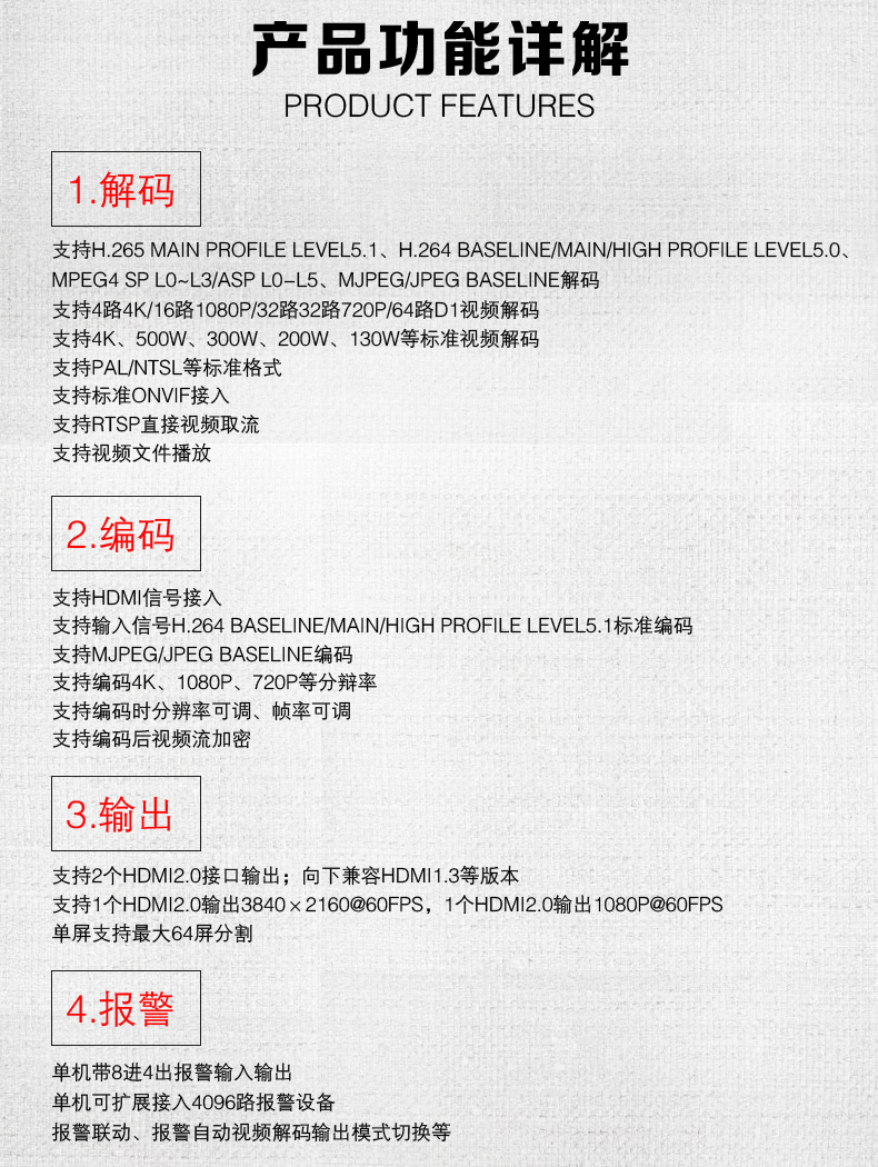 路數:2屏,4屏,6屏,8屏,10屏,12屏,16屏,18屏,20屏,22屏,24屏,26屏,28屏,32屏,36路輸出網絡數字解碼矩陣切換器采用最新的安防專用編解碼芯片,解碼、編碼、拼接、分割、畫中畫、漫游等功能,為工程項目最大程序解決大數據數字化監控系統提供解碼上墻及多信號輸入編碼等提供一站式解決方案;設備采用全鋁標準機箱,結構上大氣美觀可靠,散熱性結構化好