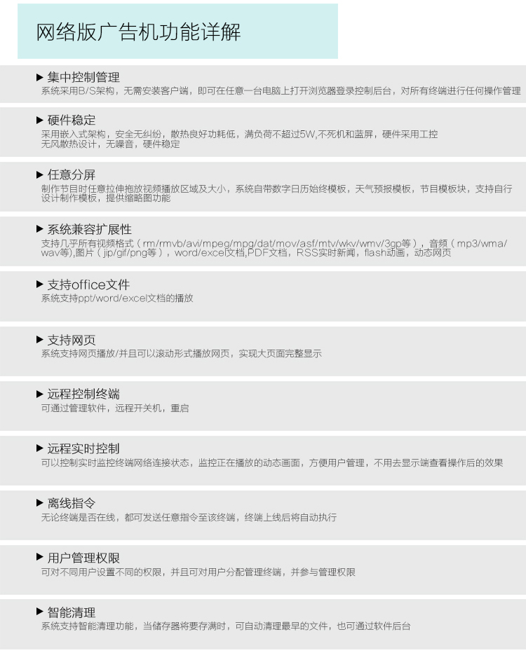 - 支持順序播放、定時(shí)播放、定時(shí)插播、間隔播放、廣告單插入